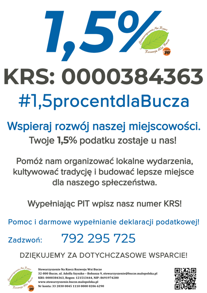 Rozpoczynamy kolejny rok zbiórki funduszy z 1,5% podatku na cele przeznaczone dla naszej miejscowości Bucze.